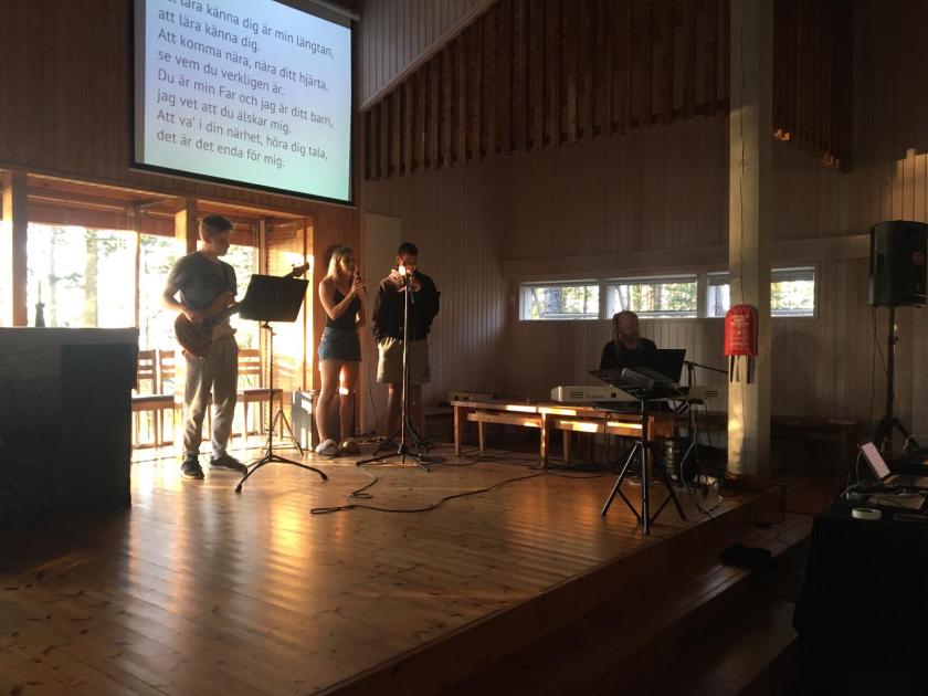 Bilden är tagen från dagens kvällsandakt. Där ser ni två hjälpisar sjunga, och två av oss vuxenledare (Daniel och mig själv) spela piano och bas.
